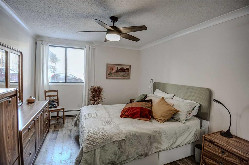 ? Quiet, 40+ age restricted living can be yours in Chinook Manor, a well-managed and maintained five storey concrete building, with elevator, that is only a couple of blocks from Chinook Center. The spacious two-bedroom unit offers 993 square feet of living space and literally needs no work. Just move in and enjoy. This home is freshly painted throughout. along with all brand-new vinyl plank flooring . Large open living room dining room combination with crown moulding overlooking your exclusive use patio. S...