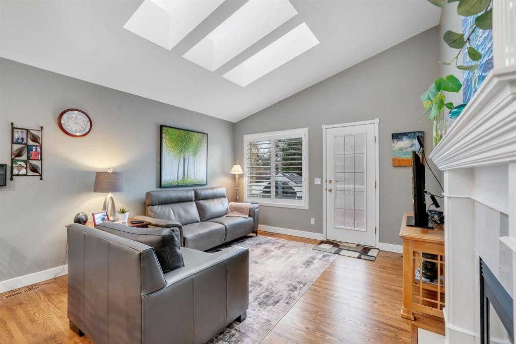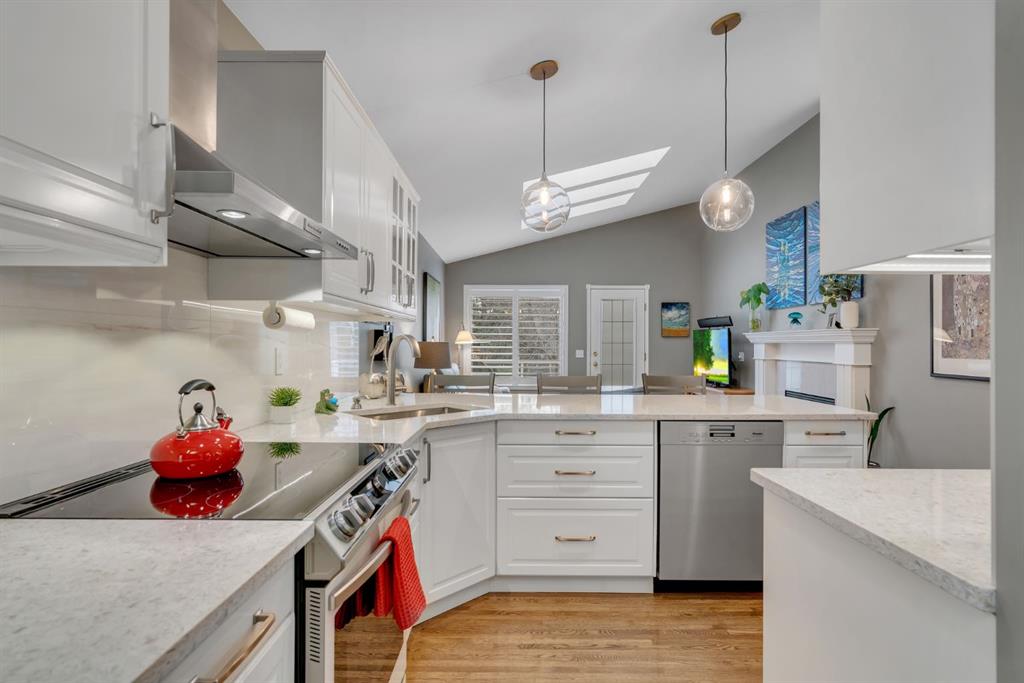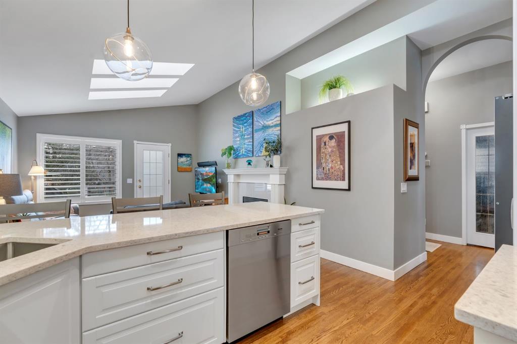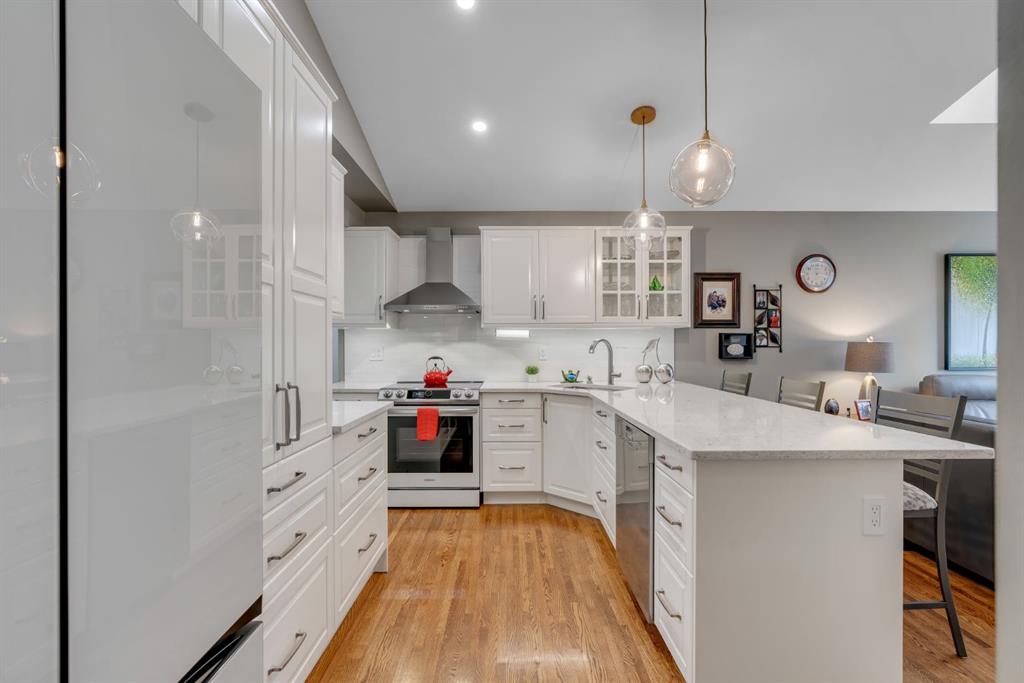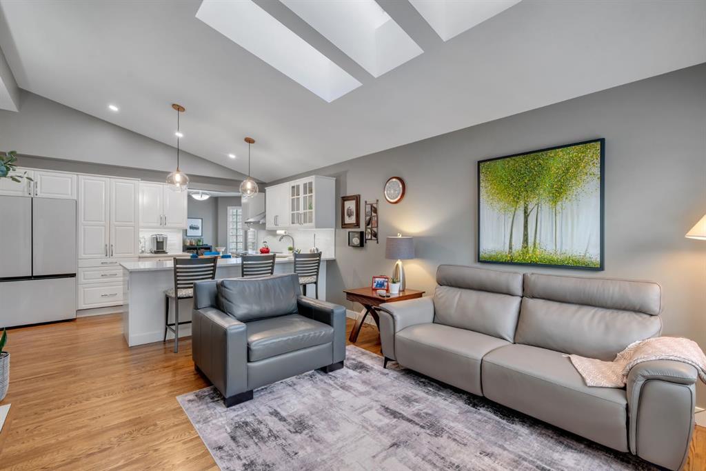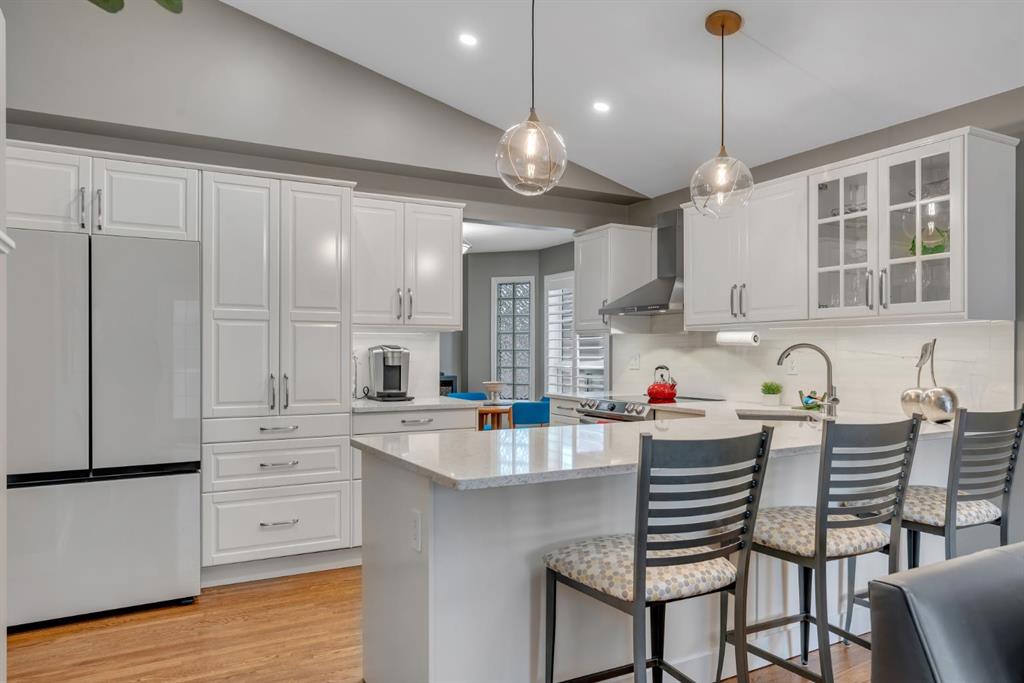 This beautifully upgraded home backs onto greenspace with a sunny south backyard and offers bungalow style living with bonus space for guests or family. As you enter, the main level features soaring vaulted ceilings in the living and dining rooms, refinished hardwood floors throughout, and an upgraded white kitchen with quartz countertops, eating bar, under-cabinet lighting, pull-out drawers, a pantry with organizers, and a newer white glass front Samsung Bespoke fridge with beverage center and induction st...