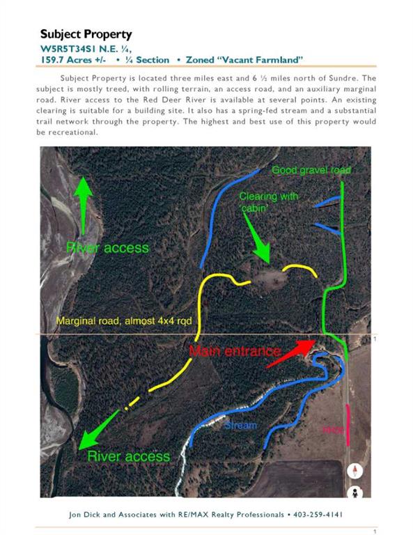 This highly secluded quarter section is currently zoned as Vacant Farmland and is conveniently located just 15 minutes from Sundre. The property offers a unique opportunity for a private retreat, ideal for building a residence or cabin, recreational activities such as hunting or fishing, or family camping. The southeast corner is suitable for hay production. A spacious clearing with direct road access provides an excellent location for construction or gatherings, while the remaining area is densely wooded w...